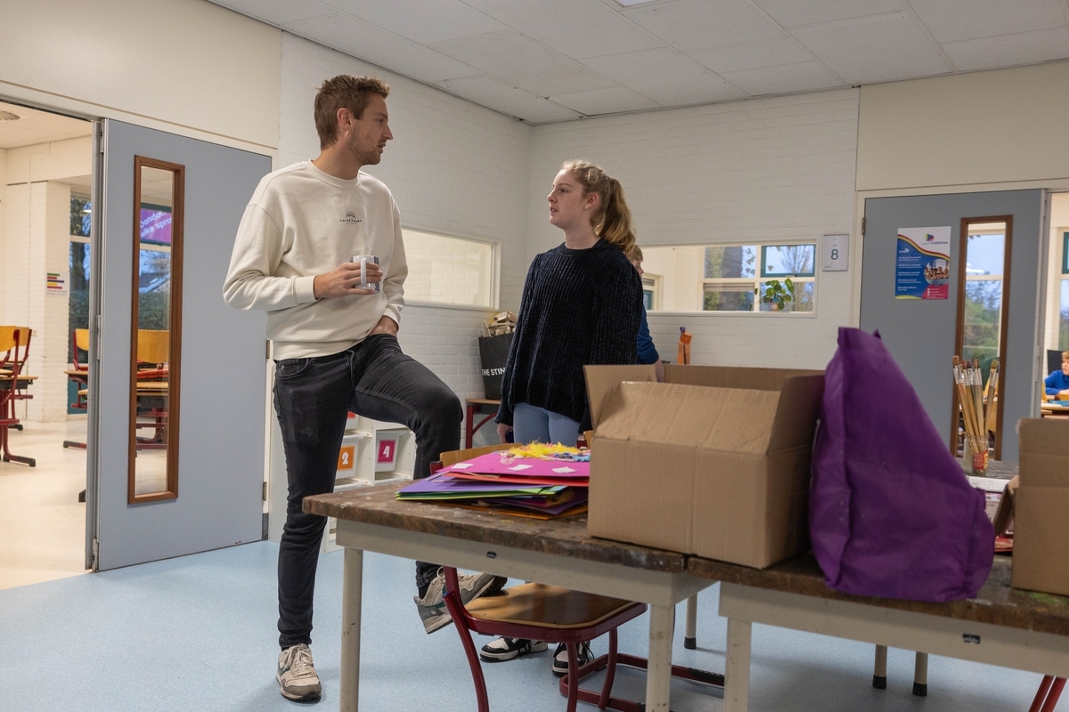 Nick in gesprek met een leerling uit groep 8