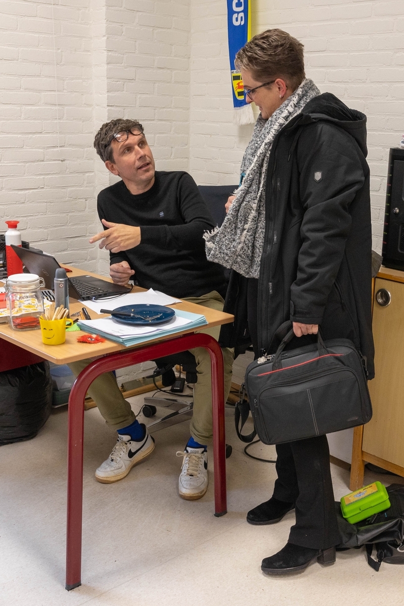 Cecilia en Meine bespreken de dag en zetten het Digibord klaar.